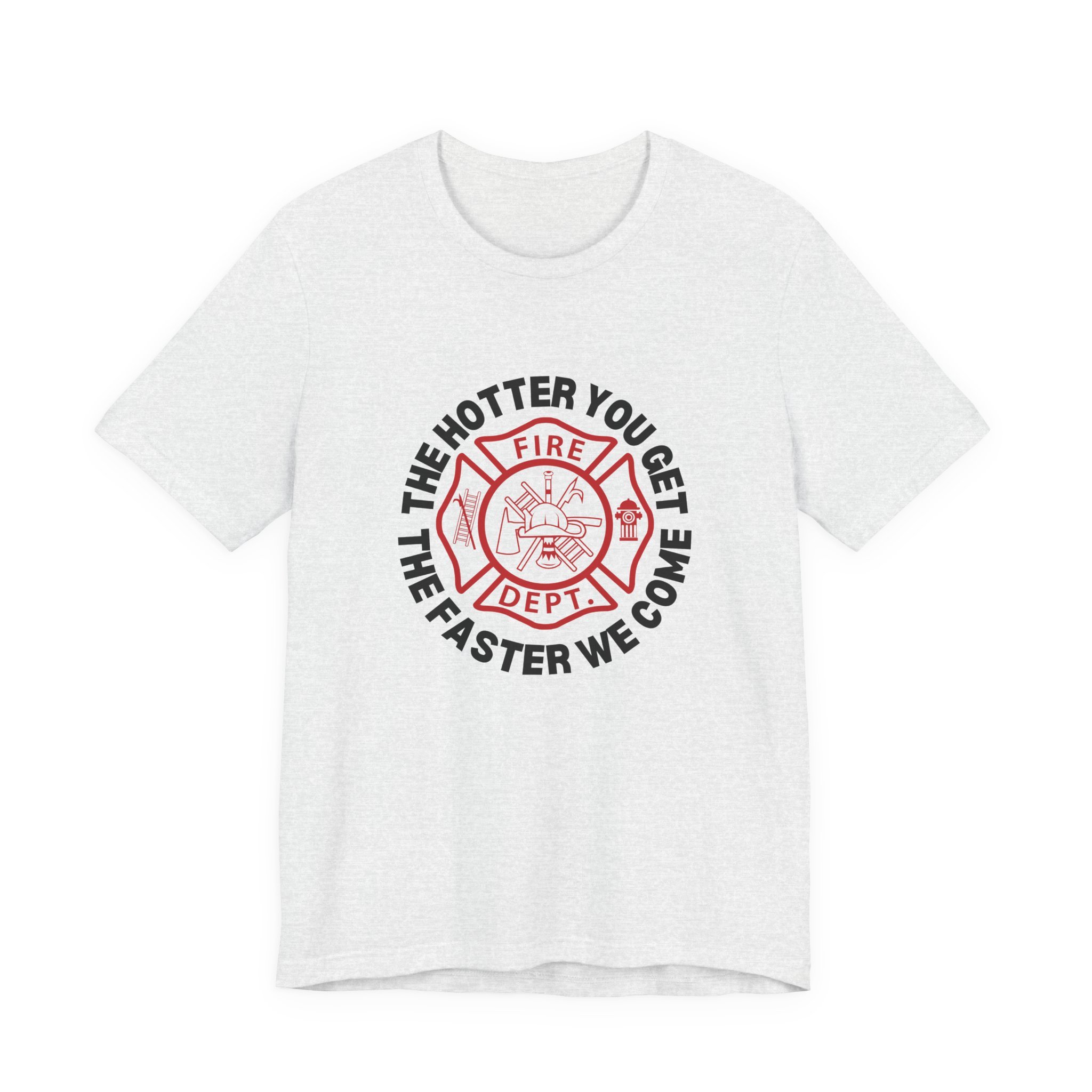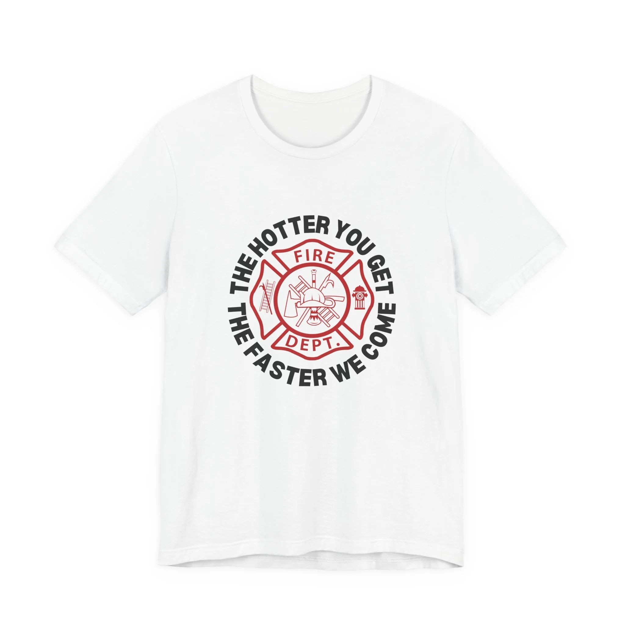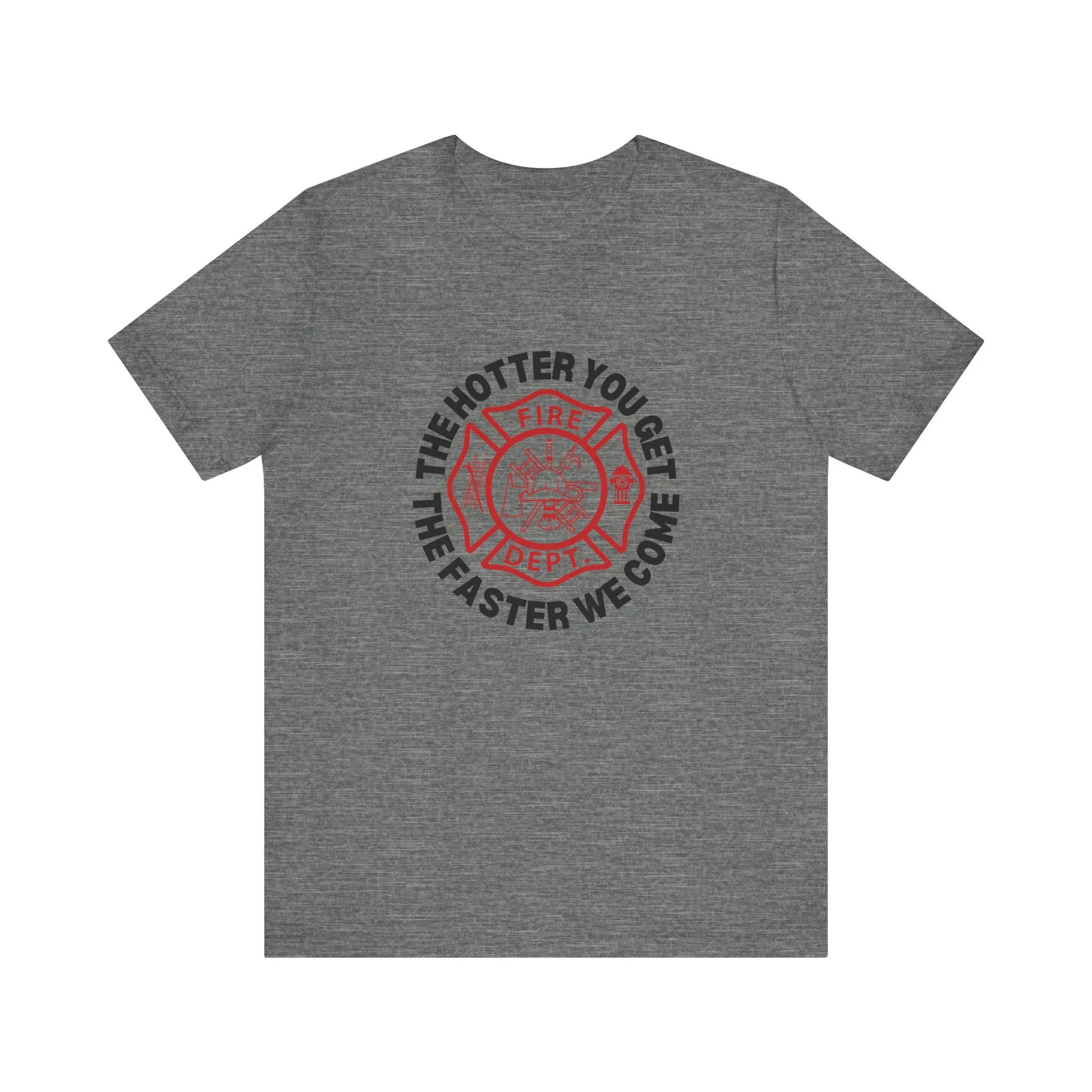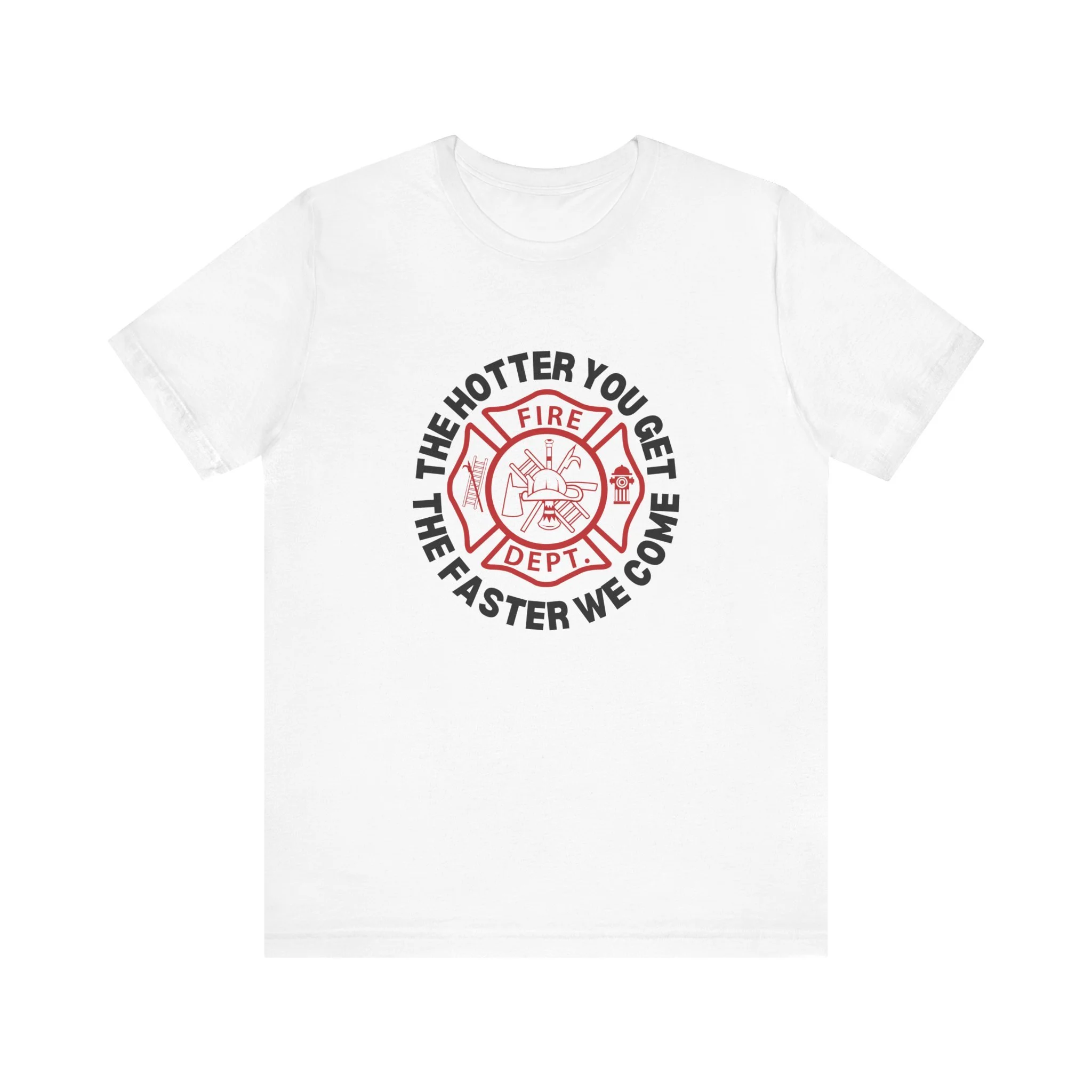 The Hotter You Get, The Faster We Come T-Shirt – Funny Firefighter Maltese Cross Tee