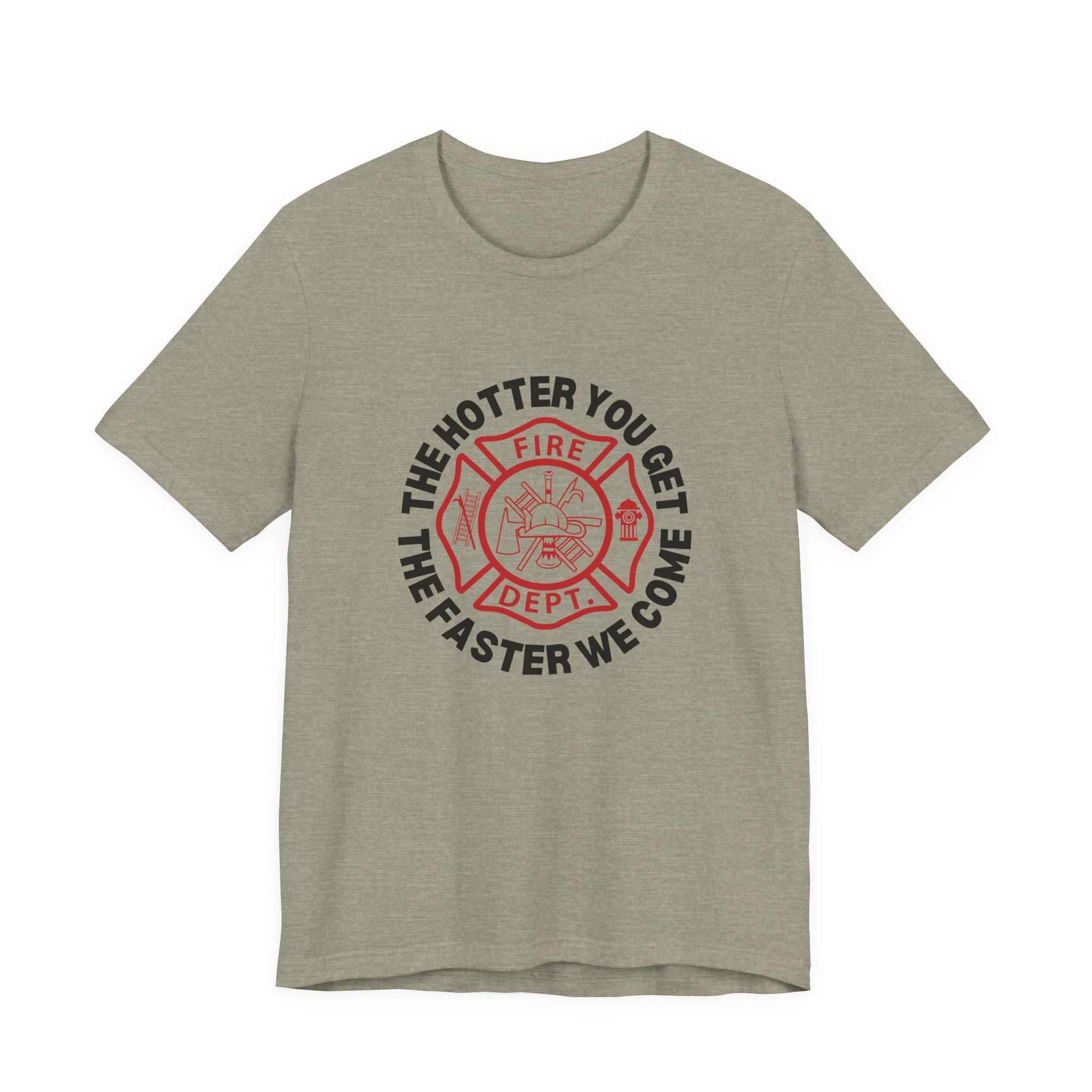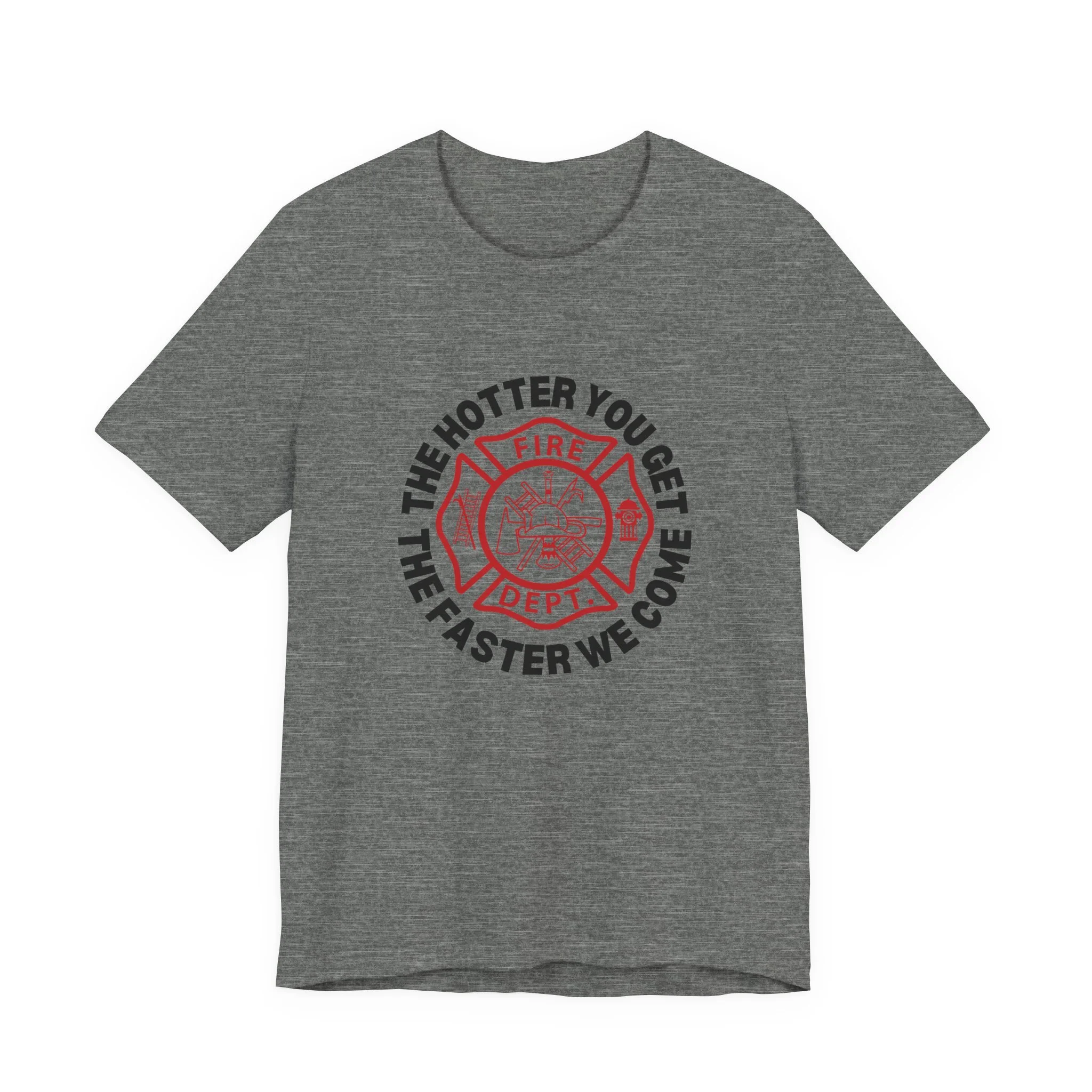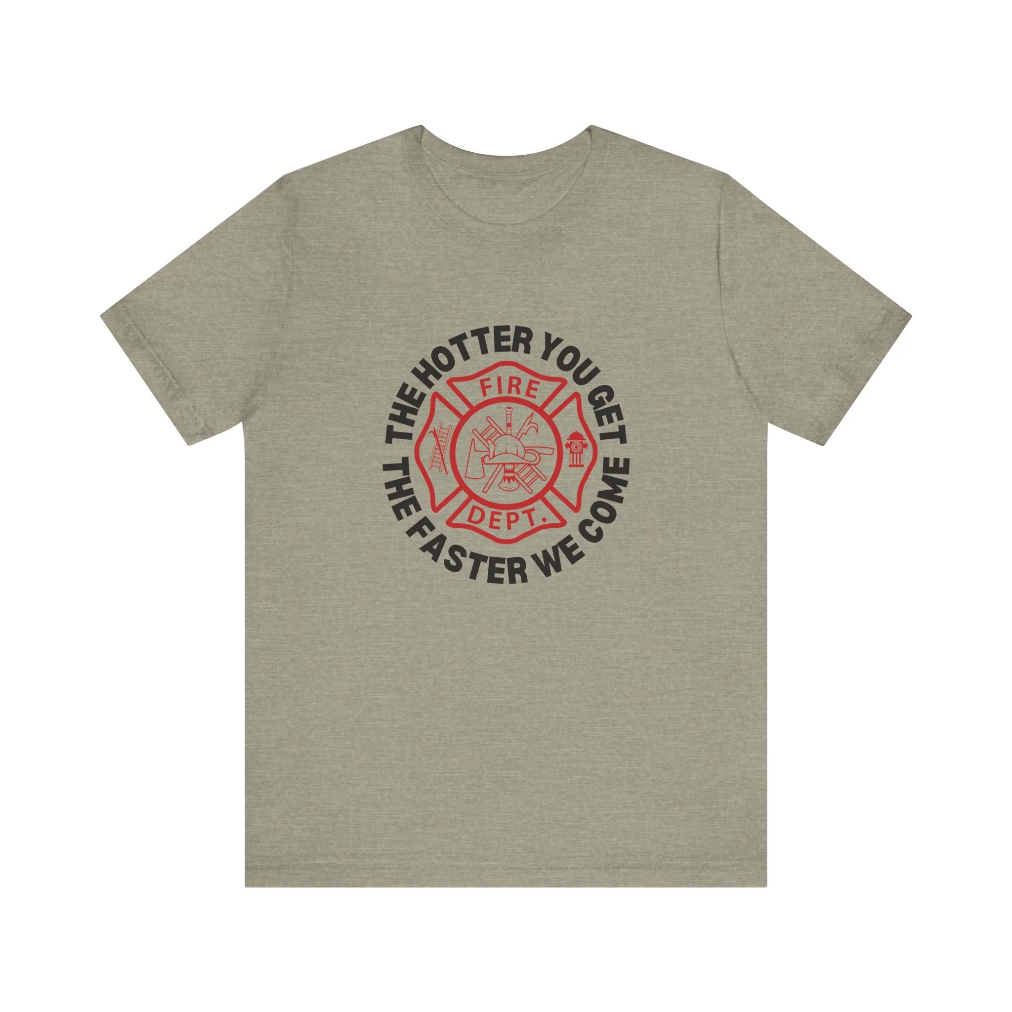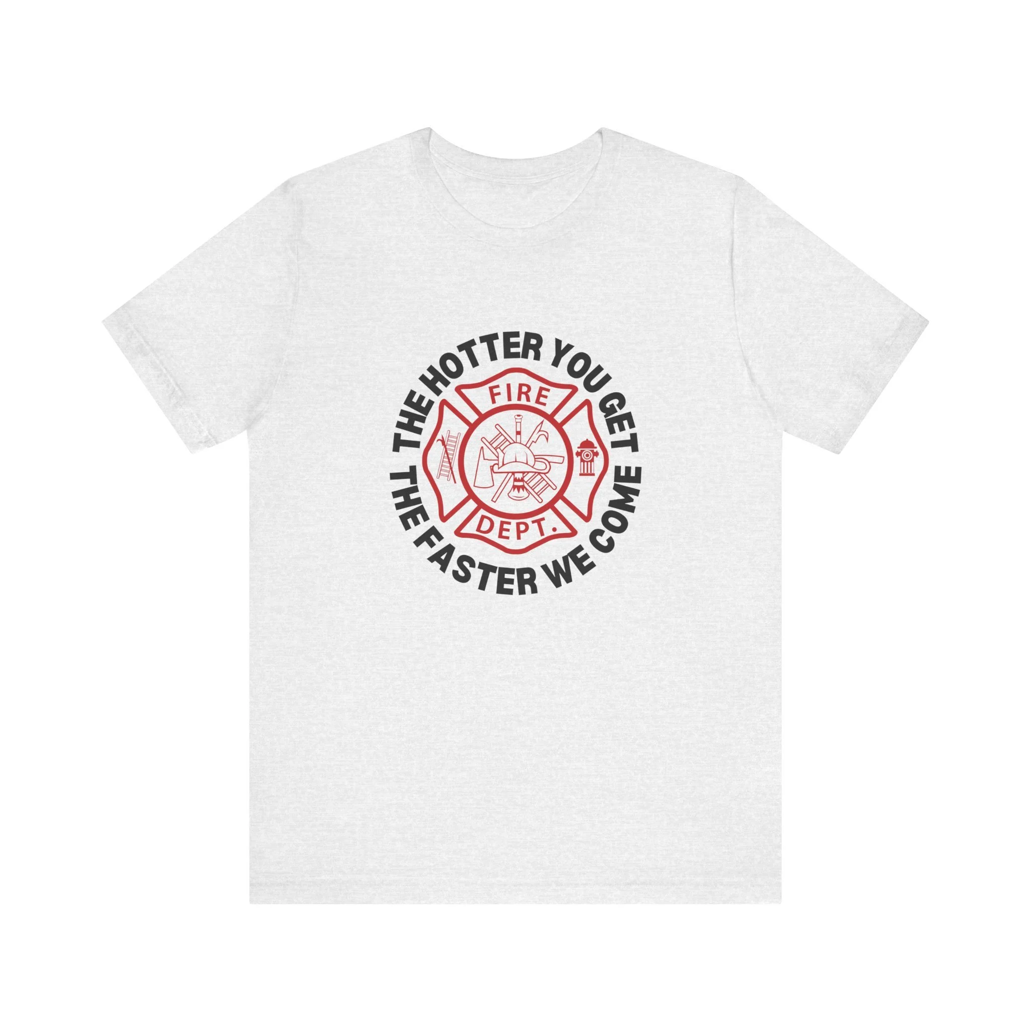 The Hotter You Get, The Faster We Come T-Shirt – Funny Firefighter Maltese Cross Tee